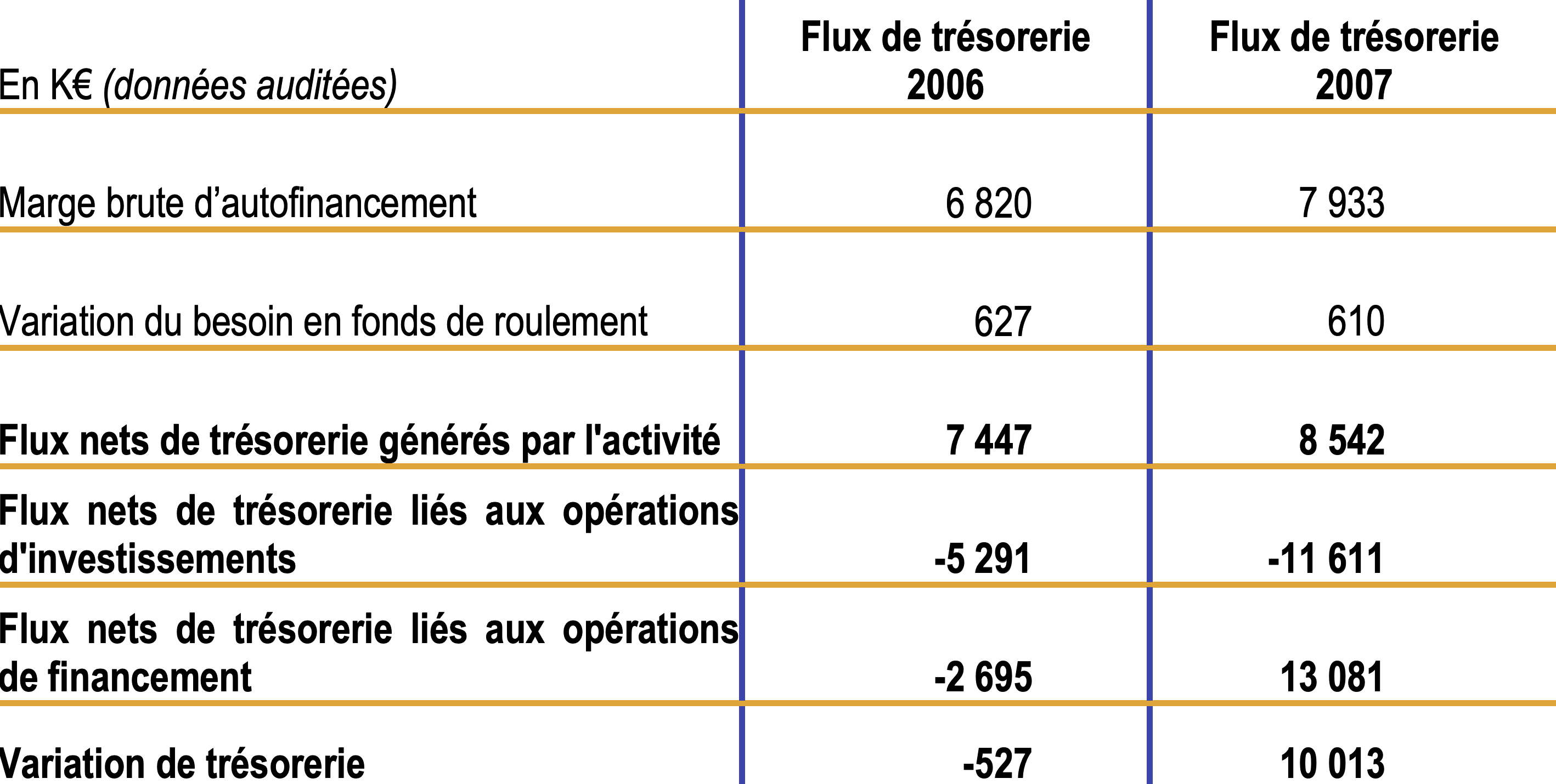 Le tableau de financement présenté ci-dessous résume les mouvements de trésorerie liés aux opérations (+8,5 M€), aux investissements (-11,6 M€, dont 5,8 M€ pour des achats de mobil-homes et 5,0 M€ pour la croissance externe) et au financement (+13,1 M€, dont 12,2 M€ liés à l’augmentation de capital).