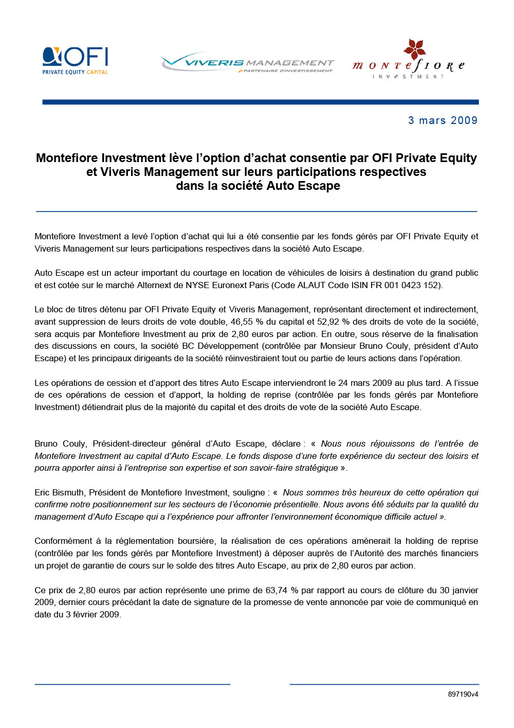 Le bloc de titres détenu par OFI Private Equity et Viveris Management, représentant directement et indirectement, avant suppression de leurs droits de vote double, 46,55 % du capital et 52,92 % des droits de vote de la société, sera acquis par Montefiore Investment au prix de 2,80 euros par action. En outre, sous réserve de la finalisation des discussions en cours, la société BC Développement (contrôlée par Monsieur Bruno Couly, président d’Auto Escape) et les principaux dirigeants de la société réinvestiraient tout ou partie de leurs actions dans l’opération.