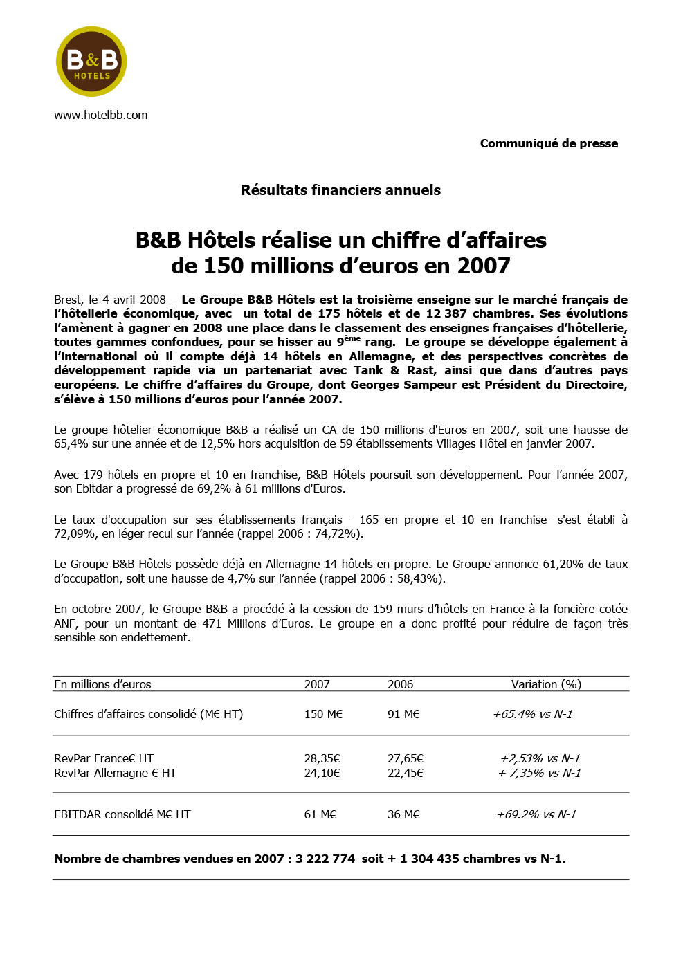 “L’année 2007 a été une année exceptionnelle et charnière pour le groupe. Elle nous a permis de consolider de façon notable notre position sur le marché français et nous pourrons désormais nous concentrer sur notre croissance européenne en étant en ligne avec nos objectifs d’atteindre 17500 chambres pour fin 2010“ indique Georges SAMPEUR, Président du Directoire de B&B Hôtels.