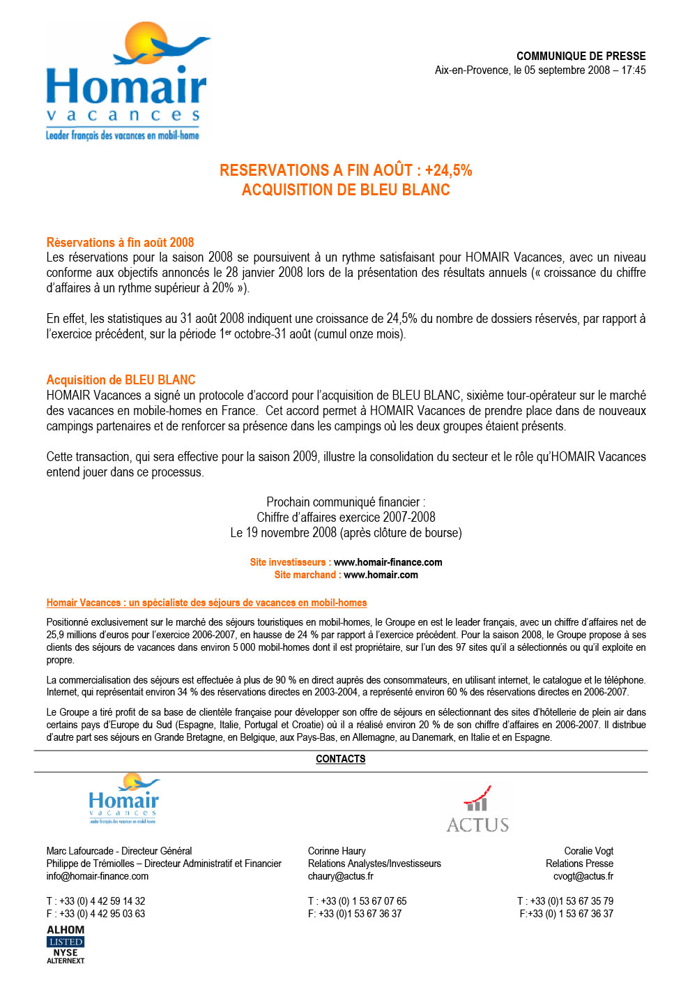 Les réservations pour la saison 2008 se poursuivent à un rythme satisfaisant pour HOMAIR Vacances, avec un niveau conforme aux objectifs annoncés le 28 janvier 2008 lors de la présentation des résultats annuels (“croissance du chiffre d’affaires à un rythme supérieur à 20%“).
