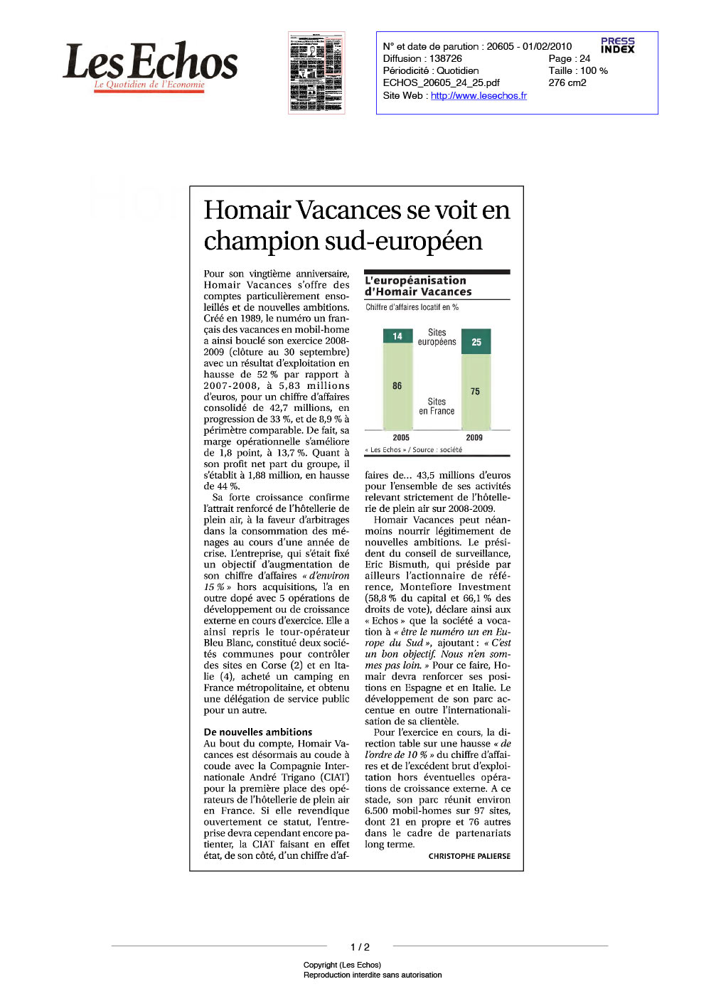 Au bout du compte, Homair Vacances est désormais au coude à coude avec la Compagnie Internationale André Trigano (CIAT) pour la première place des opérateurs de l’hôtellerie de plein air enFrance. Si elle revendique ouvertement ce statut, l’entreprise devra cependant encore patienter, la CIAT faisant en effet état, de son côté, d’un chiffre d’affaires de 43,5 millions d’euros pour l’ensemble de ses activités relevant strictement de l’hôtellerie de plein air sur 2008-2009. Homair Vacances peut néanmoins nourrir légitimement de nouvelles ambitions. Le président du conseil de surveillance, Eric Bismuth, qui préside par ailleurs l’actionnaire de référence, Montefiore Investment (58,8% du capital et 66,1% des droits de vote), déclareainsiaux “Echos“ que la société a vocation à “être le numéro un en Europe du Sud“, ajoutant: “C’est un bon objectif. Nous n’en sommes pas loin.“ Pour ce faire, Homair devra renforcer ses positions en Espagne et en Italie. Le développement de son parc accentue en outre l’internationalisation de sa clientèle. Pour l’exercice en cours, la direction table sur une hausse “de l’ordre de 10%“ du chiffre d’affaires et de l’excédent brut d’exploitation hors éventuelles opérations de croissance externe. A ce stade, son parc réunit environ 6.500 mobil-homes sur 97 sites, dont 21 en propre et 76 autres dans le cadre de partenariats long terme.