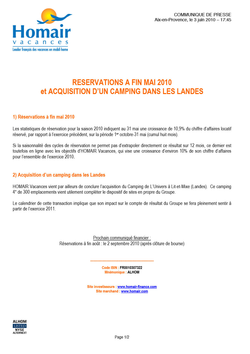 HOMAIR Vacances vient par ailleurs de conclure l’acquisition du Camping de L’Univers à Lit-et-Mixe (Landes). Ce camping 4* de 300 emplacements vient utilement compléter le dispositif de sites en propre du Groupe. Le calendrier de cette transaction implique que son impact sur le compte de résultat du Groupe se fera pleinement sentir à partir de l’exercice 2011.