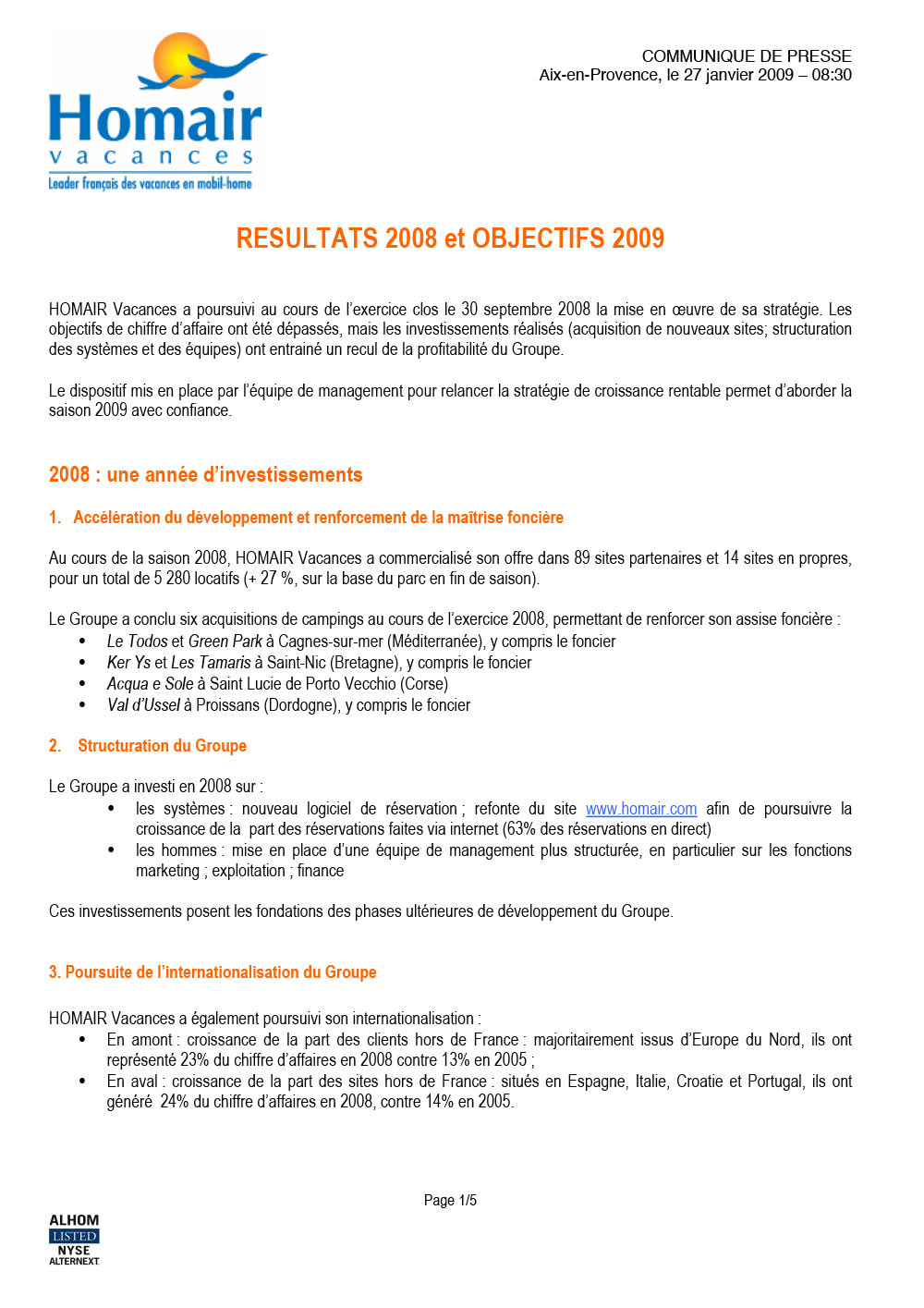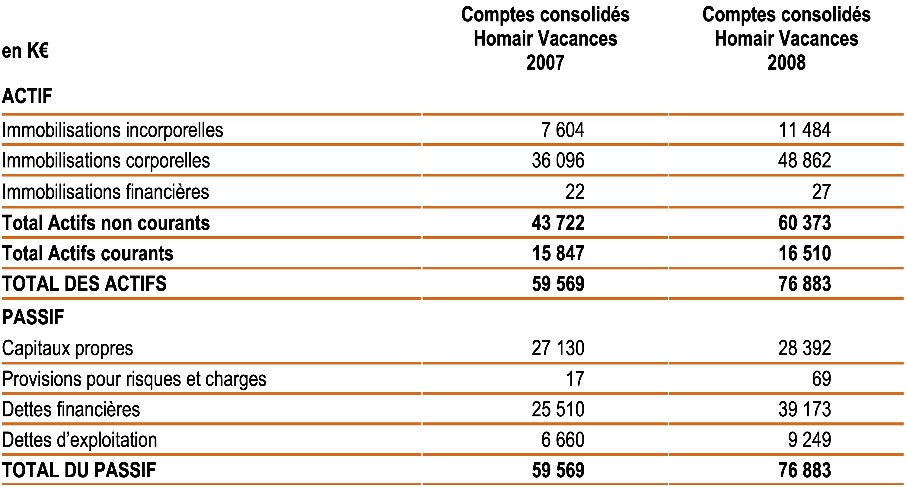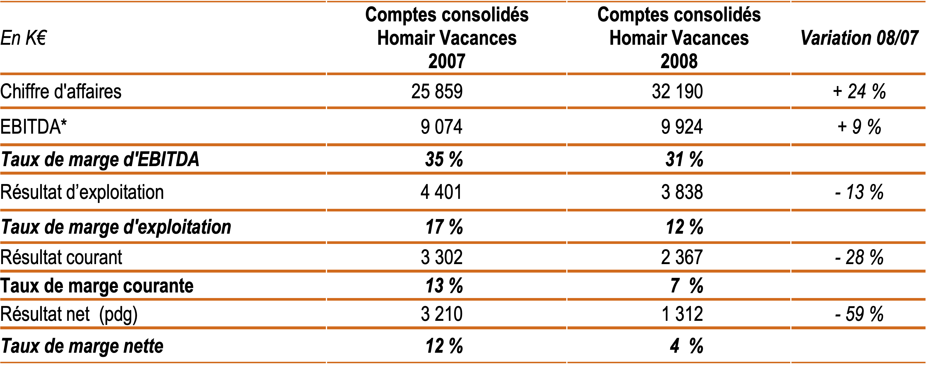 HOMAIR Vacances a poursuivi au cours de l’exercice clos le 30 septembre 2008 la mise en œuvre de sa stratégie. Les objectifs de chiffre d’affaire ont été dépassés, mais les investissements réalisés (acquisition de nouveaux sites; structuration