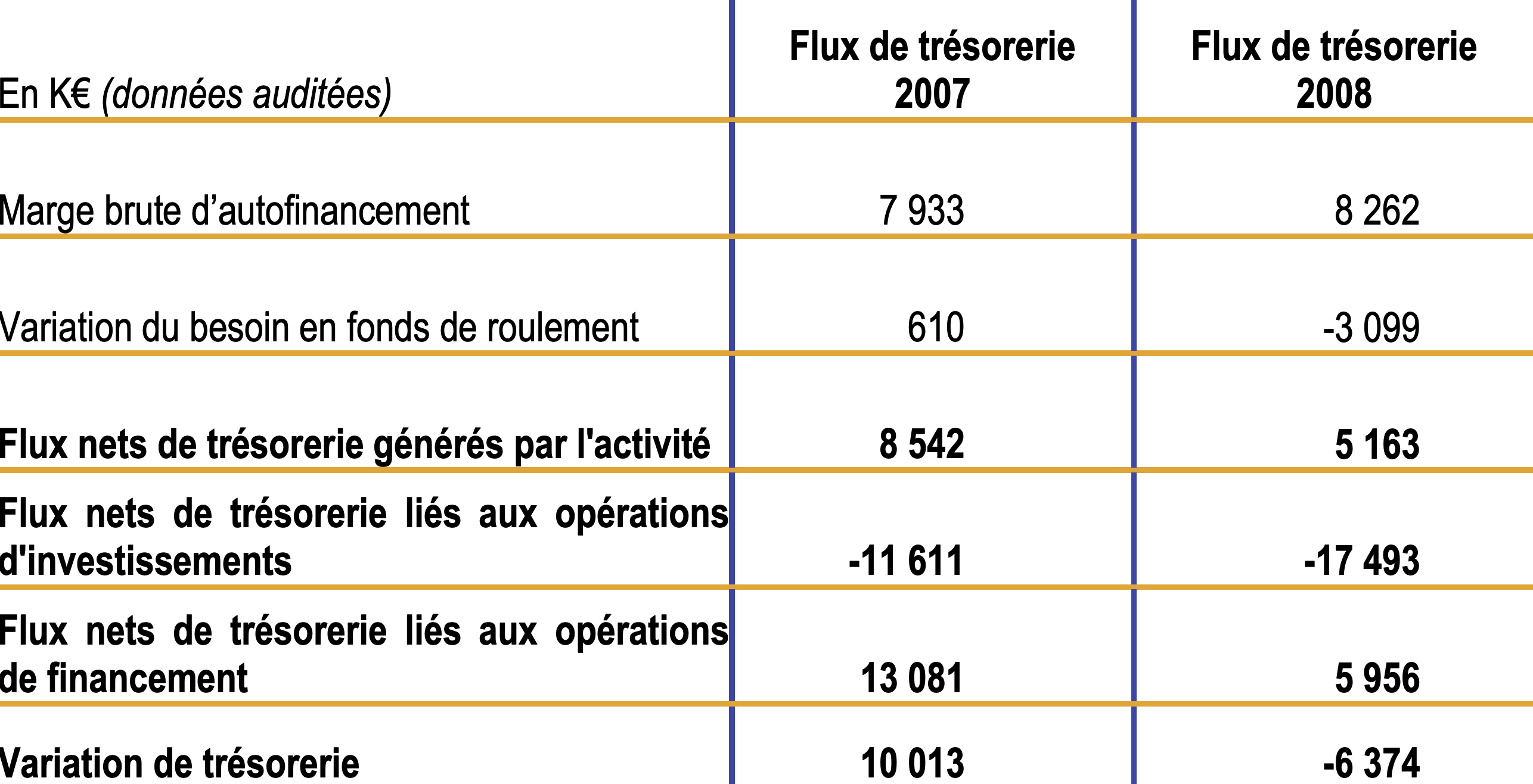 Le tableau de financement présenté ci-dessous résume les mouvements de trésorerie liés aux opérations (+5,2 M€), aux investissements (-17,5 M€) et au financement (- 1,4 M€).