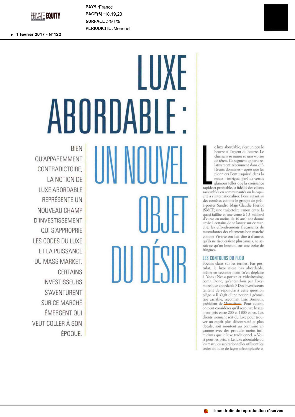Soyons clairs sur les termes. Par postulat, le luxe n’est pas abordable, même en seconde main (n’en déplaise à Yoox/Net-a-porter et videdressing. com). Donc, qu’entend-on par l’oxymore luxe abordable ? Des investisseurs tentent de répondre à cette question piège. « Il s’agit d’une notion à géométrie variable, reconnaît Eric Bismuth, président de Montefiore. Pour autant, on peut considérer qu’il recouvre le segment prix entre 200 et 1000 euros. Les clients viennent soit du luxe pour trouver un esprit plus décontracté et plus décalé, soit montent au contraire en gamme avec des produits moins intimidants que le luxe traditionnel. » Voilà pour les prix. « Le luxe abordable ou les marques aspirationnelles utilisent les codes du luxe de façon décomplexée et naturelle, c’est l’anti estime Frédéric Biousse, ex-codirecteur général de SMCP qui a, depuis, fondé la société d’investissement Experienced Capital Partners, justement dédiée à ce segment. Nous avons créé ce business model il y a une quinzaine d’années chez Comptoir des Cotonniers (repris par le japonais Uniqlo, ndlr) et l’avons poursuivi ensuite chez Sandro Maje. » Depuis, avec sa casquette d’investisseur, il a choisi d’investir dans de jeunes marques fun et modernes, telles le Slip Français (compter une trentaine d’euros quand même pour acquérir un sous-vêtement made in France) dont il a pris 36,5 % des parts. Experienced Capital Partners a aussi cru en Balibaris (mode masculine), Maison Standards (e-shop de basiques intemporels), Sœur (mode féminine) ou encore les chemises Figaret.